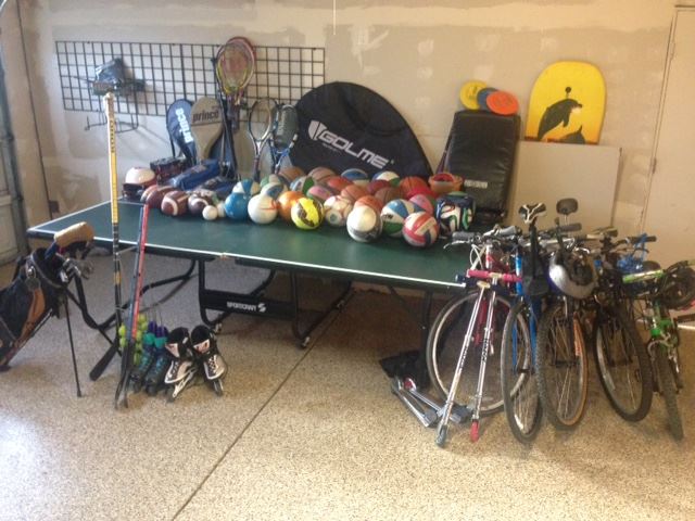 My garage – 17 basketballs, 4 footballs, 7 soccer balls, 12 tennis rackets, 2 golf clubs, 2 gloves, 2 balls, 3 discs,1 ping pong table, 4 snorkels, 3 hockey sticks, 1 bat, 1 volleyball, 5 bikes, 1 soccer net, 1 blocking pad, 2 rollerblades, 2 scooters, 3 softballs, basket of tennis balls, and 1 boogie board